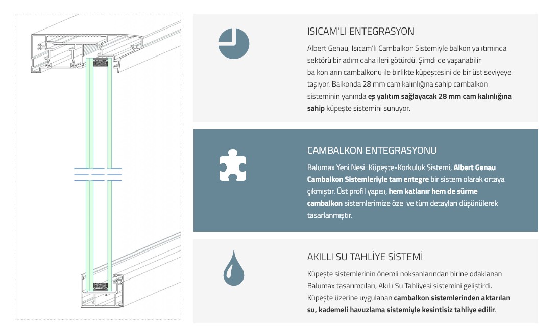 Isıcam'lı Entegrasyon: Albert Genau tarafından tasarlanan Isıcam’lı Cambalkon Sistemi ile birlikte, balkon yalıtımında sektöre öncülük ediyor. 28 mm cam kalınlığına sahip cambalkon sistemine ek olarak, aynı yalıtım standartlarını taşıyan 28 mm cam kalınlığına sahip küpeşte sistemi sunuyor.