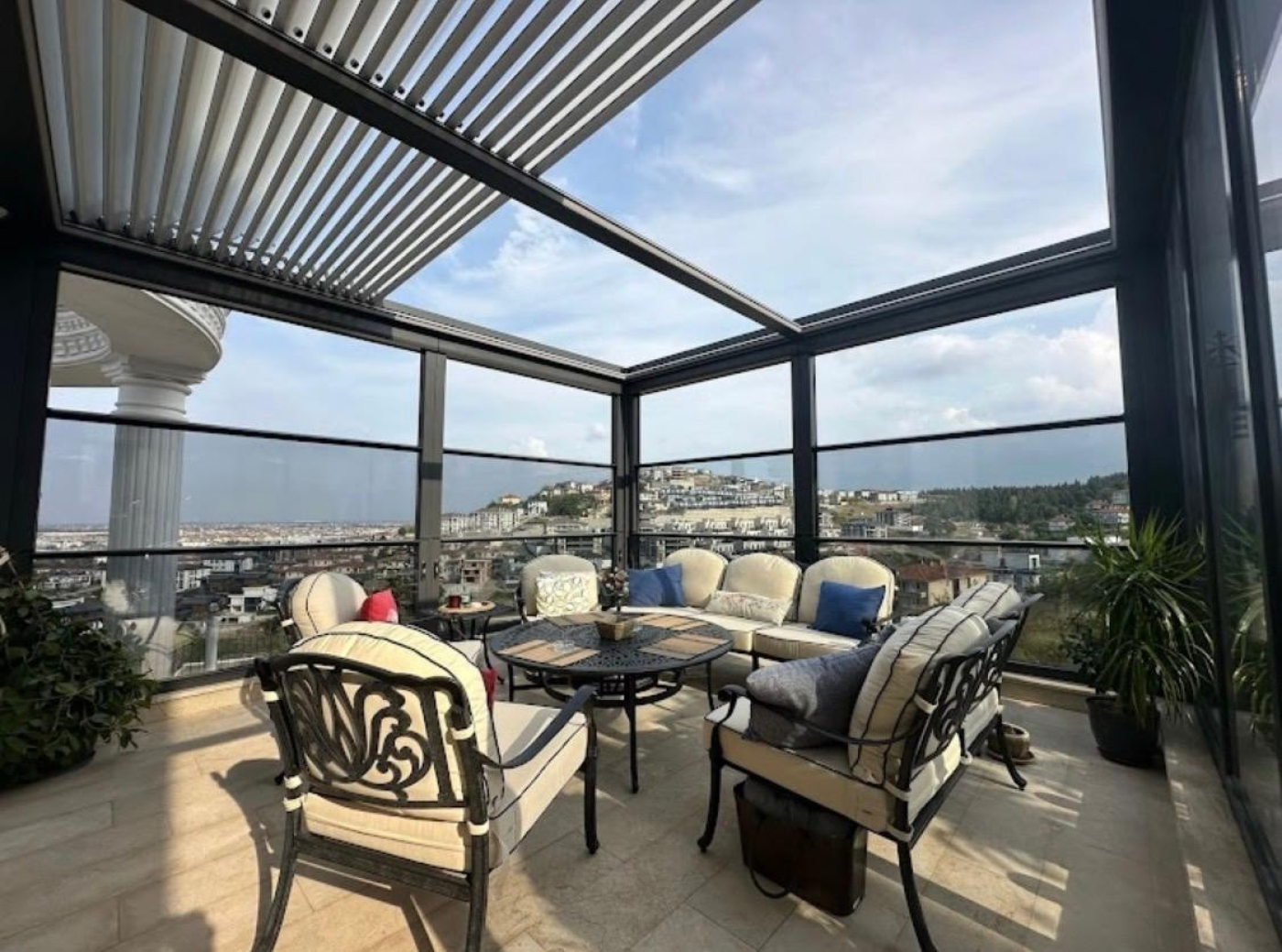 Motorlu giyotin cam sistemi ise dikey hareket eden cam panelleriyle alanı açıp kapatmayı son derece pratik hale getirir. Manzarayı kesmeden rüzgâr, yağmur ve toza karşı mükemmel koruma sağlar. Otomatik çalışma sistemi, güvenlik sensörleri ve estetik tasarımıyla açık alanlara modern bir dokunuş katar.