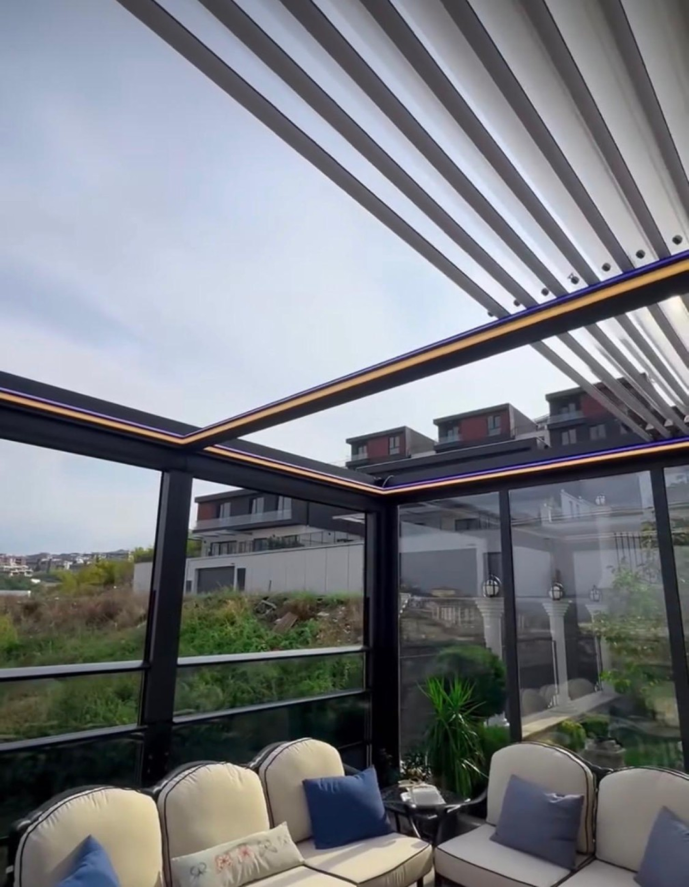 Bioklimatik pergola, açılır–kapanır alüminyum lamel yapısı sayesinde güneş ışığını, gölgeyi ve hava sirkülasyonunu tam kontrol altına almanızı sağlar. Yağışlı havalarda tamamen kapanarak yüksek koruma sunarken, güçlü altyapısı ve su tahliye sistemleriyle her koşulda sorunsuz kullanım sağlar.