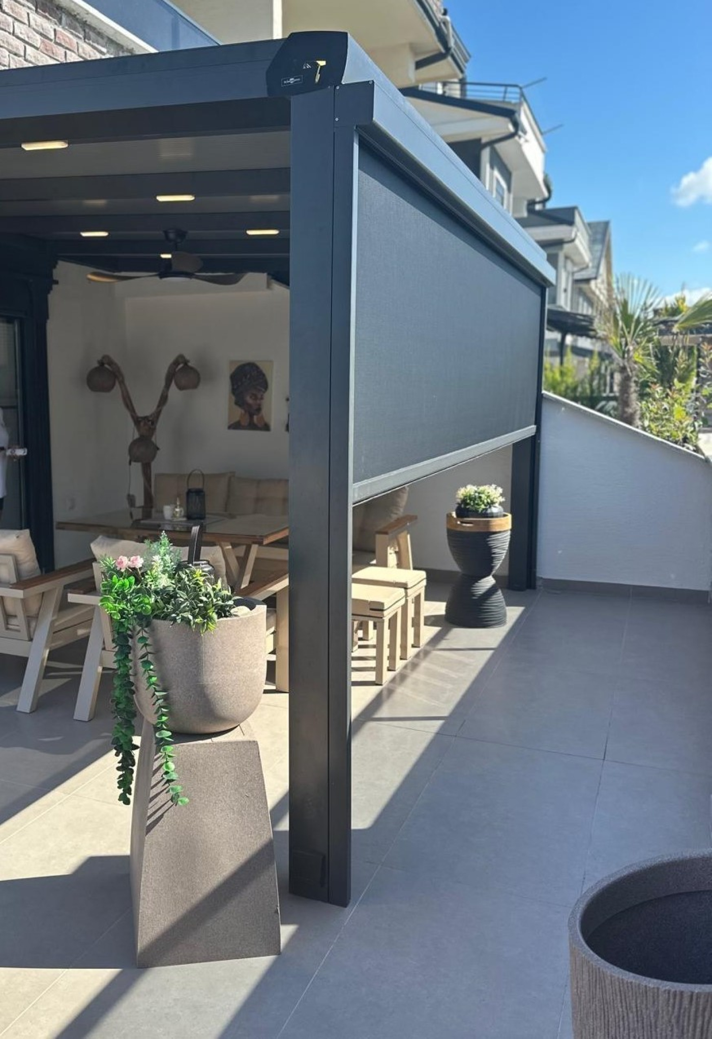 Güneş ışığını kontrol altına alırken yağmur, rüzgâr ve toz gibi olumsuz hava koşullarına karşı etkili bir bariyer sağlar. Estetik görünümü ve motorlu kullanım kolaylığıyla yaşam alanlarınıza hem konfor hem de fonksiyonellik katar.